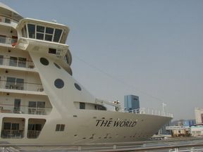 | 世界周航のクルーズ客船、バハマ船籍ザ・ワールド(The World)号、ノルウェーのフォーセン造船所で202年竣工(就航) ザ・ワールド号、 43,524屯、長さ196.3m、乗客390人(分譲アパートメント110室、ゲスト用スィートルーム88室)と乗組員280人が乗船 |