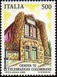 ←コロンブスのうまれた家(いえ)、イタリアのジェノバにあります。 ←イタリアで 1992/9/18にコロンブスの新大陸発見500年記念 (しんたいりくはっけん 500 ねんきねん)として 発行された郵便切手(ゆうびんきって) |